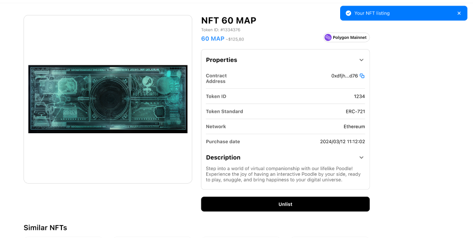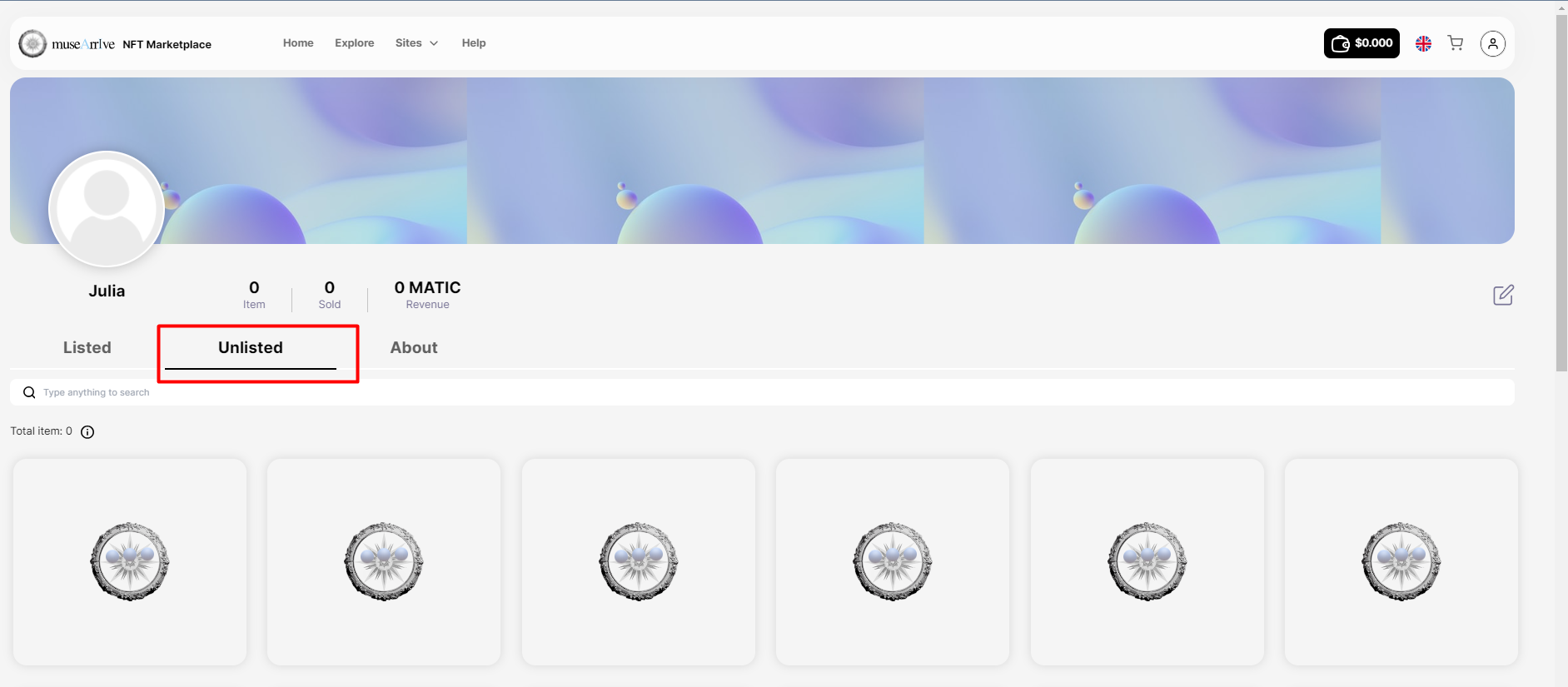 3. After connecting your web3 wallet, all of your NFTS will be showing in your profile section in NFT Marketplace. Access My Profile -> Unlisted: